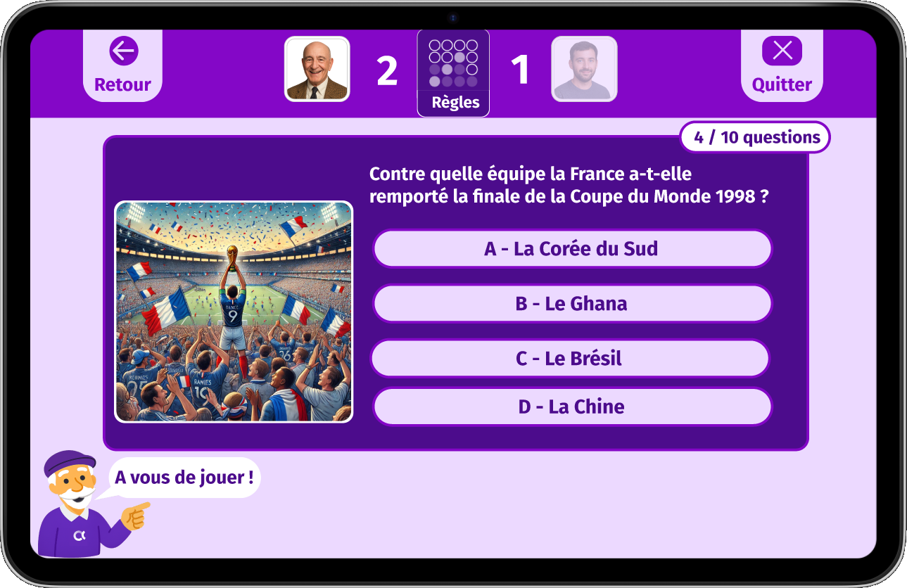 Gena-App est disponible sur ordinateur, tablette et mobile, vous permettant de jouer où que vous soyez. Pour de l'animation, utilisez simplement un ordinateur et branchez-le à un vidéo-projecteur. Vous ravirez votre public !